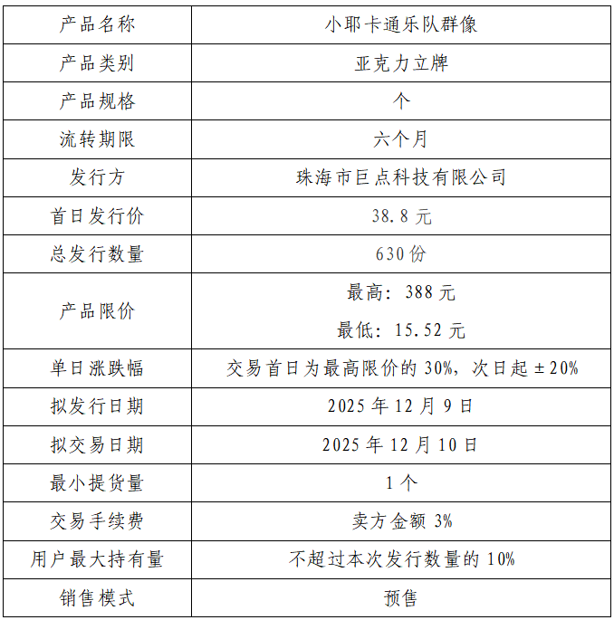 根据安徽省文化产权交易所文潮集市平台(以下简称“文潮集市”)的有关规定,经发行方申请,文潮集市审核同意,《小耶卡通乐队群像》正式在文潮集市发行,具体信息公告如下: