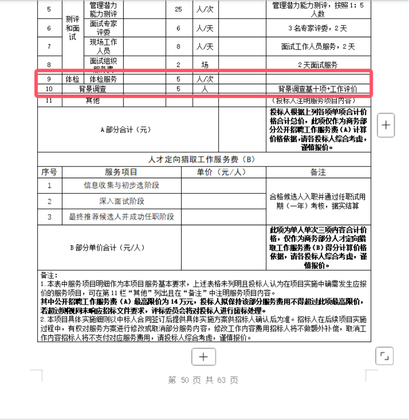 疑问二:背景调查基十项+工作评价单价,招标人是否有背景调查基十项的具体明细要求?几段工作经历的背景调查?以及工作评价是否有特殊要求?其中背景调查是否包含考察?考察是否有特殊要求,几段工作经历的考察?(由于下方截图中有提到)